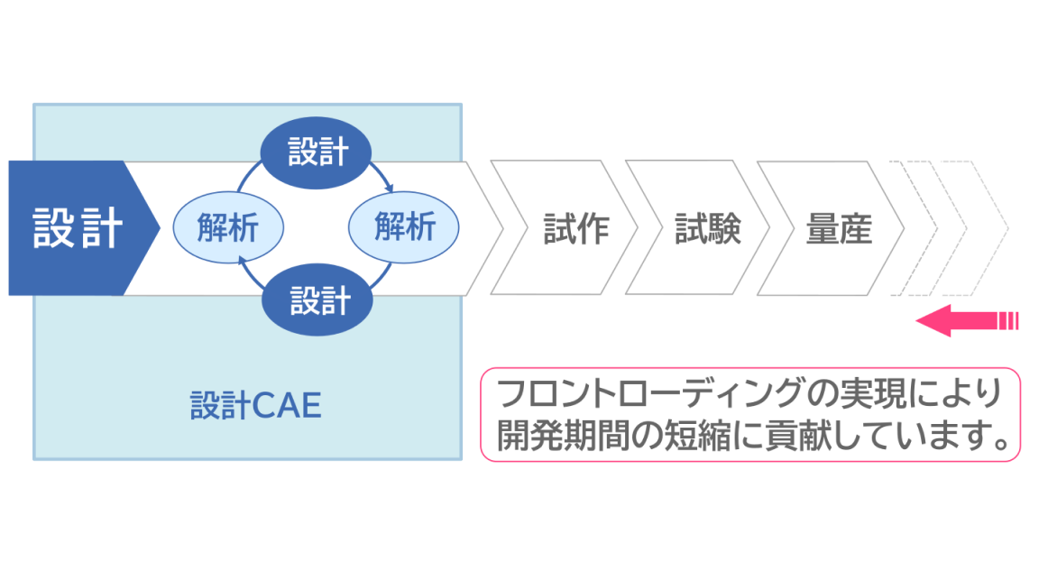 成形メーカーとして、実際の製品開発に即した解析技術を保有しています。設計CAEの活用によるフロントローディングの実現より開発期間の短縮に貢献しています。また、成形メーカーとして実物との比較検証や、実際の開発経験に基づく解析技術により、より実践的な形で開発をサポート致します。