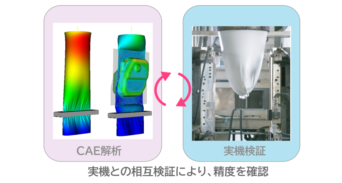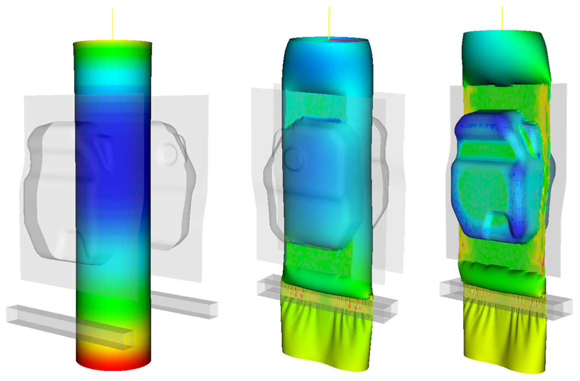 弊社が最も得意とするブロー成形の成形解析です。ブロー成形の複雑な溶融樹脂の挙動を再現することで、事前に肉厚分布と不具合発生を予測して、勘と経験に頼らない最適な形状提案が可能です。