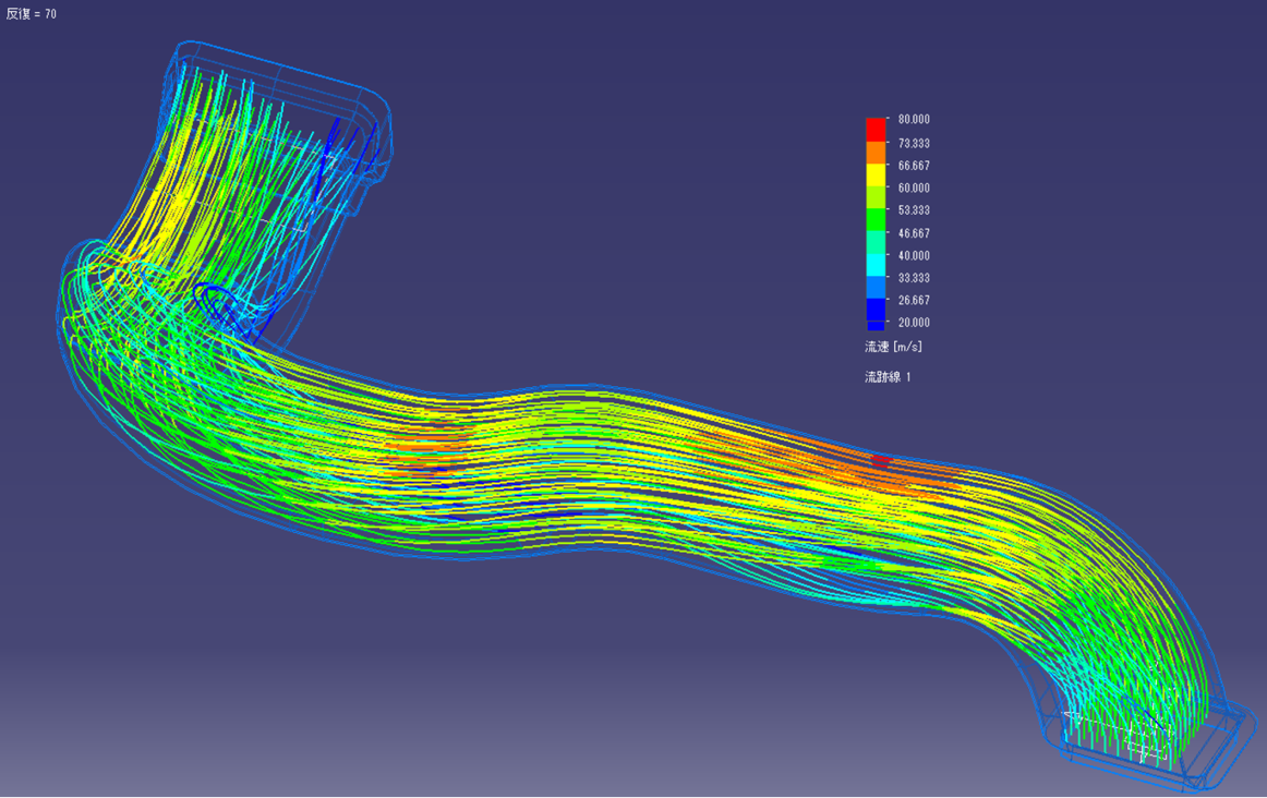 弊社の主力製品の一つである空調ダクトの流量解析が可能。ブロー成形解析と組み合わせることで、成形性を考慮しながら、最適な流路設計が可能です。